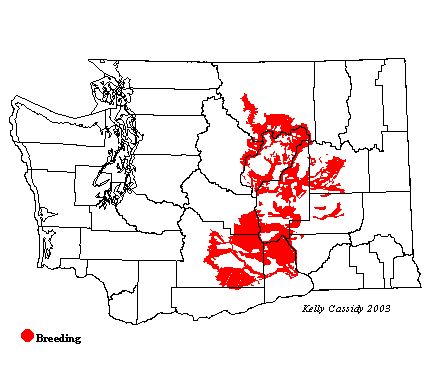 Sage Sparrows are common to uncommon breeders in sagebrush landscapes of the Columbia Basin. They are rare breeders in the Okanogan Valley, and possible breeders in the Methow Valley. Not much is known about this species' exact habitat requirements, and large areas of sagebrush that appear to be suitable habitat are often lacking Sage Sparrows. Some areas where they can be found relatively commonly from March through July, and to a lesser extent to mid-August, are the Quilomene Wildlife Area (Kittitas County), the Yakama Indian Reservation, from Dry Creek along the Horse Heaven Hills to Mabton, the southern end of the Yakima Training Center (Yakima County), the Wahluke Slope (Franklin County), and Sagebrush Flats (Douglas County).
