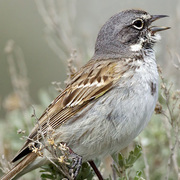 Restricted to open shrub lands and grasslands, Washington's Sage Sparrows are found in hot, dry areas of eastern Washington with mature big sagebrush stands. These sparrows seem to prefer sites with sparse shrub cover, arranged in patches, with bare ground in between. During migration they are rarely seen, but can be found in almost all sagebrush habitat, including degraded sage, in eastern Washington.